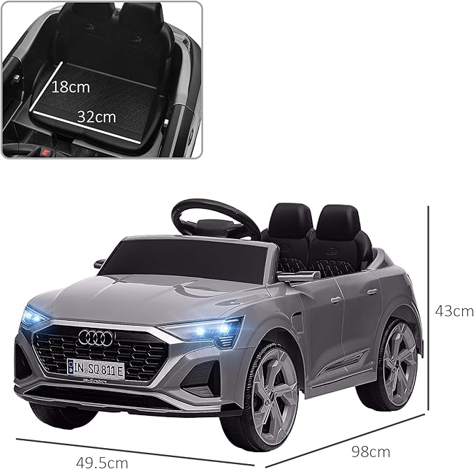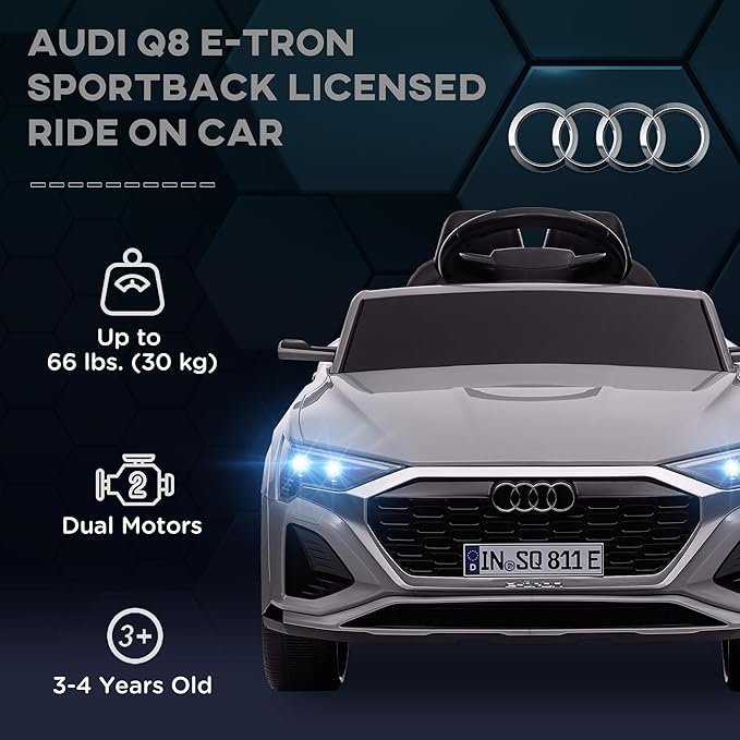 - This 12V kids electric car, modeled after the Audi Q8 e-tron Sportback, delivers an authentic and thrilling driving experience for your little adventurer.