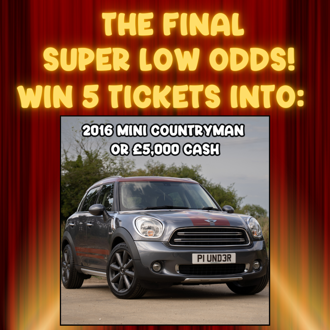 THERES ONLY a matter of HOURS left on the clock for the MAIN COMP to close!!! This is a LOW ODDS mini draw for the chance to win an additional 5 tickets into the MAIN “2016 MINI COUNTRYMAN OR £5,000! ”  Competition.