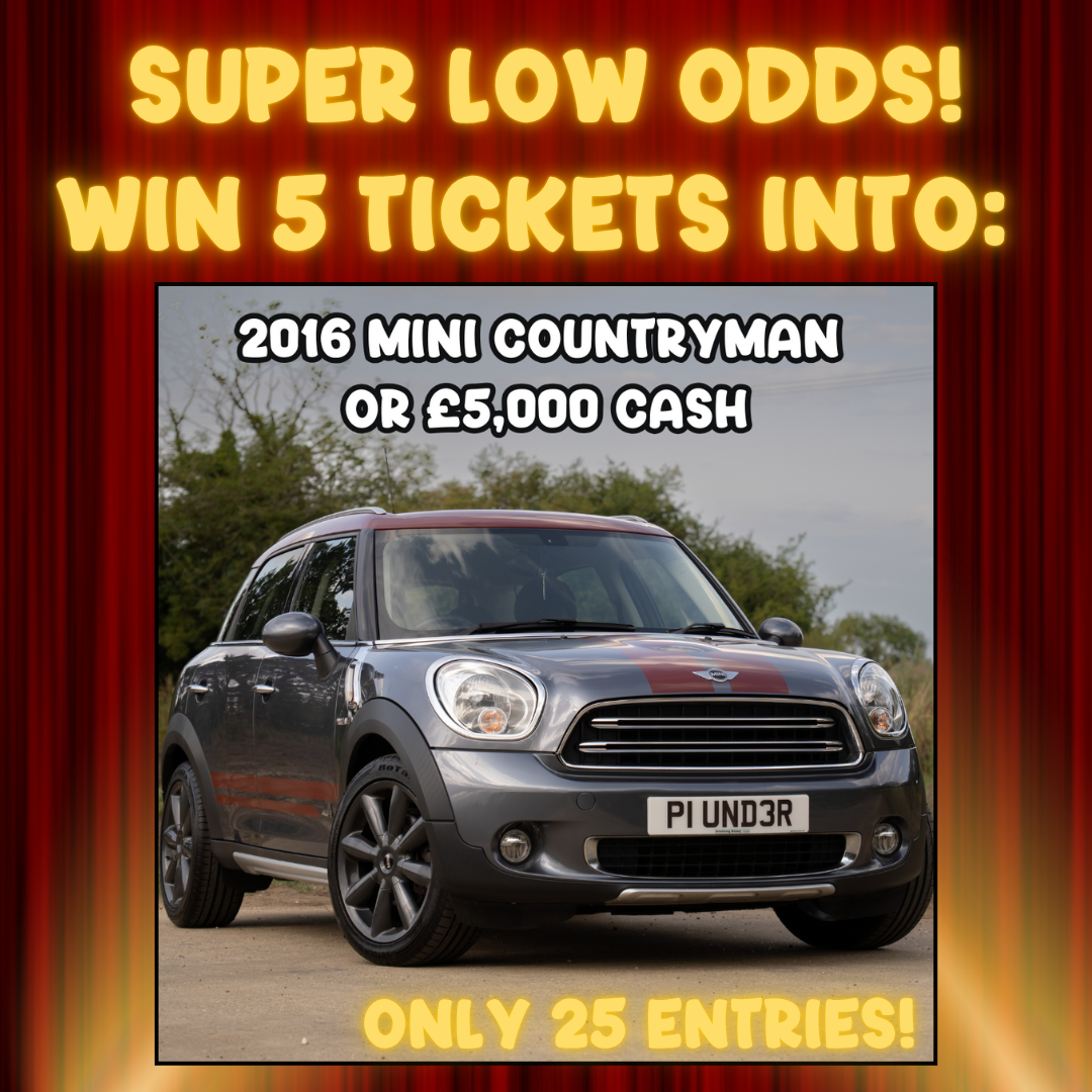 THERES ONLY 1 day left on the clock for the MAIN COMP to close!!! This is a LOW ODDS mini draw for the chance to win an additional 5 tickets into the MAIN “2016 MINI COUNTRYMAN OR £5,000! ”  Competition.