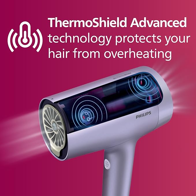 Philips Hair Dryer 7000 Series, ThermoShield with Advanced Technology, Mineral and Water Ionic, comes with a Nozzle and a Hair Diffuser, (1800W, Model BHD720/13)