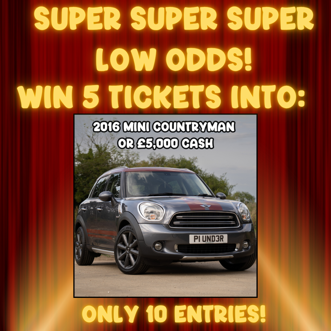 This is a SUPER SUPER SUPER LOW ODDS mini draw for the chance to win an additional 5 tickets into the MAIN “2016 MINI COUNTRYMAN OR £5,000! ” Competition. with only 10 available tickets!